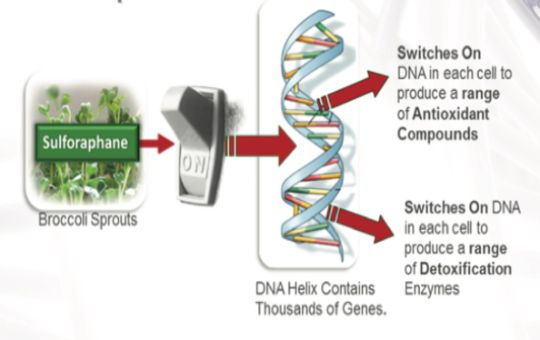 Sulforaphane, found in Broccoli Sprouts is easily absorbed by cells and start to act as a signaling molecule, sending messages to the cells and activating the "switch" within the cells to awaken our genes, triggers the production of Glutathione and detoxification enzymes.
